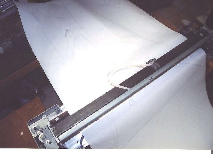 Der Plotter in Aktion. Hier werden Zuschnittmuster für Lenkdrachen geplottet. Das Papier wird mit Unterdruck auf dem Plotter gehalten. Dazu sind in einer Stahlschiene hunderte von Löchern angebracht. Unter der Schiene ist ein Lüfter angebracht, der die Luft über die Löcher absaugt. Wie man sieht geht es bei mir im Keller schon recht eng zu. Der Plotter braucht eben viel Arbeitsfläche. Die Zeichnungen sind mit CorelDraw 8 erstellt worden, da CorelDraw 5 nicht so große Zeichenoberfächen verwalten kann. Der Plot ist über 2Meter lang und ca. 1Meter breit. Ich arbeite am Plotter nur mit PCNC, da es den Plotter erheblich schneller arbeiten lassen kann als CNCPROFI. Zur Zeit liegt die Arbeitsgeschwindigkeit bei 5Meter pro Minute. Das ist schon recht fix.