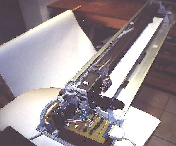 Nachdem ich mir schon lange vorgenommen hatte einen Stiftplotter zu bauen, kam mir der Zufall zur Hilfe. Auf dem Elektronikrecycling fand ich einen großen Stiftplotter von HP. Dieses Teil war zwar schon ziemlich alt und hatte nur einen Stift, aber das störte mich nicht. Wichtig war nur, das ich den Plotter nun nicht selberbauen mußte. Für den Plotter mußte ich nur 40.-DM bezahlen. Die groben Maße des Gerätes sind 140cm lang, 30cm breit, ca. 20 KG Gewicht. Der Plotter faßt Papier bis 97 cm Breite bei endloser Zuführung. Es stellten sich bis zum reibungslosen Betrieb noch viele Probleme ein, von denen ich noch berichten werde.