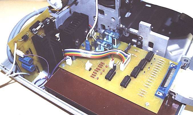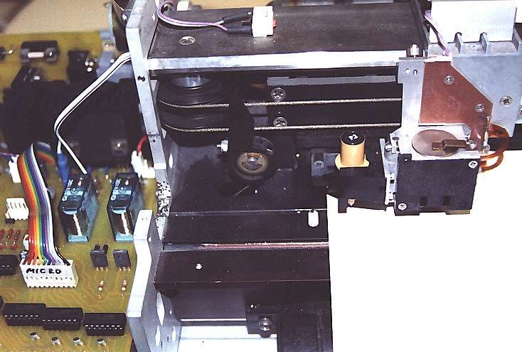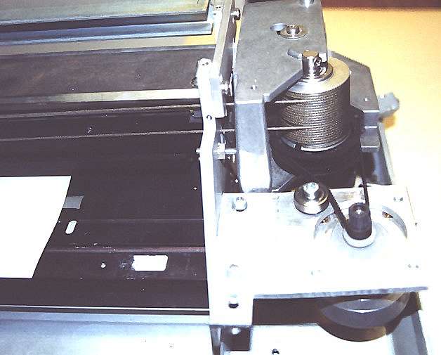 Zum Ansteuern der Plottermechanik baute ich eine Schrittmotorelektronik mit L297/L298. Die Elektronik funktionierte zwar auf Anhieb einwandfrei, war aber von der Auflösung (Halbschrittbetrieb) leider ungeeignet um befriedigende Ergebnisse aufs Papier zu bringen. Das lag aber nicht nur der Elektronik, die Mechanik tat ein Übriges dazu. Orginal wurde der Stift über ein Seilzugsystem bewegt, welcher 10:1 untersetzt von einem Servomotor angetrieben wurde. Den Servomotor und das Getriebe mußte ich leider ausbauen, da ich keine Motoransteuerung und kein passendes Ritzel zum Getriebe hatte. Stattdessen baute ich zuerst ein 1:1 Getriebe ein. Beim ersten Betrieb erlebte ich dann meine blaues Wunder. Die Auflösung war die absolute Katastrophe. Ein gezeichneter Kreis bestand aus hunderten von Zacken. Von hoher Auflösung keine Spur. Also baute ich als nächste eine neue Schrittmotorendstufe mit IMT901. Diese arbeitet im Achtelschrittmodus. Ein weiterer Probelauf mit dem gleichen Getriebe brachte aber keine wesentliche Besserung. Es dauerte etliche Wochen bis ich die passenden Zahnscheiben in einigen Druckern gefunden hatte. Nun wird der Stiftantrieb 4:1 untersetzt im Achtelschrittmodus angetrieben. Um auf die richtige Schrittweite zu kommen mußte noch der Trommelumfang des Seilantriebes errechnet werden. Das konnte allerding nur als Näherungswert angenommen werden, wie sich später herrausstellte. Ich kam nach stundenlangen Messen und Fummeln auf eine Schrittweite von 53,76 Schritte pro Millimeter. Der Papierantrieb wird 2,4:1 untersetzt im Achtelschrittmodus angetrieben. Ich kam so auf eine Schrittweite von 43,47 pro Millimeter. Wie man jetzt schon sieht erreicht der Plotter trotz allen Aufwands nicht die Genauigkeit der Fräse. Diese hat schon im Halbschrittbetrieb 80 Schritte pro Millimeter Auflösung. Sie ist also schon ca. 1.5 mal genauer. Trotzdem ist die Auflösung zum Zeichnen ausreichend genau. Eine höhere Schrittgenauigkeit kann ich nur noch durch eine höhere Untersetzung erreichen. Aber ich habe bisher keine anderen Zahnscheiben gefunden.
