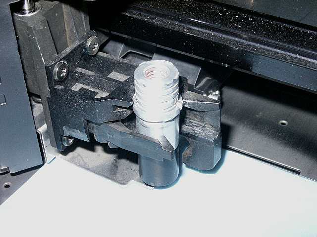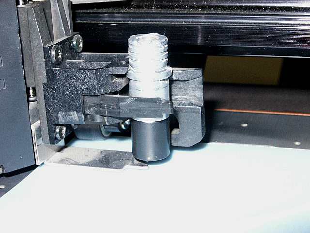 Nun zwei Detailaufnahmen von der Stifthalterung. In meinem Fall ist hier das Roland Schleppmesser mit Messerhalter zu sehen. Der Plotter muß hierbei zwingend die Möglichkeit haben den Messerhalter aus dem Stiftkarussell zu entnehmen. Dies muß sein, da es sonst zu Fehlermeldungen des Plotters kommt und der Plotter ansonsten seinen Dienst verweigert.