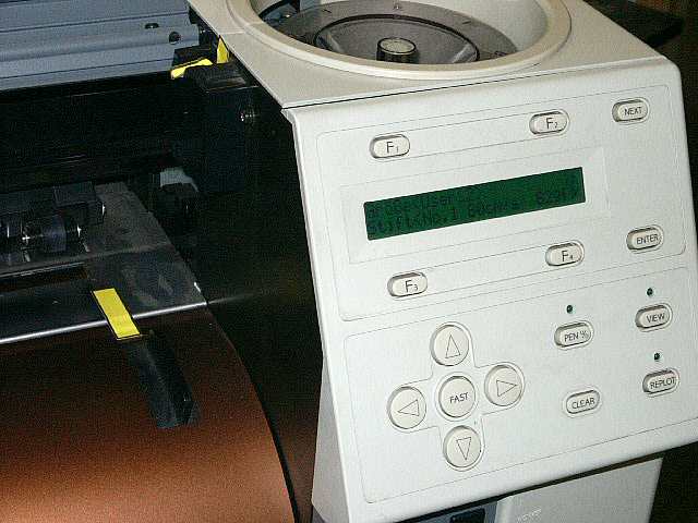 Über das Panel können alle Parameter eingestellt werden. Die Tasten F1-F4 dienen zum Einstellen der Plotterparameter. Damit wird auch die Blattgröße, der Stiftandruck und die Stiftgeschwindigkeit eingestellt. Mit den JOG Tasten kann dann das Messer oder der Stift sehr genau an den Nullpunkt gefahren werden. Von diesem Punkt aus wird dann geschnitten. Über die Replott-Taste wird die letzte Grafik so oft wie gewünscht ausgeplottet. Da der Plotter intern über 4MB RAM Speicher verfügt, können auch sehr große Plottdateien ohne PC-Bedienung schnell wiederholt geplottet werden.